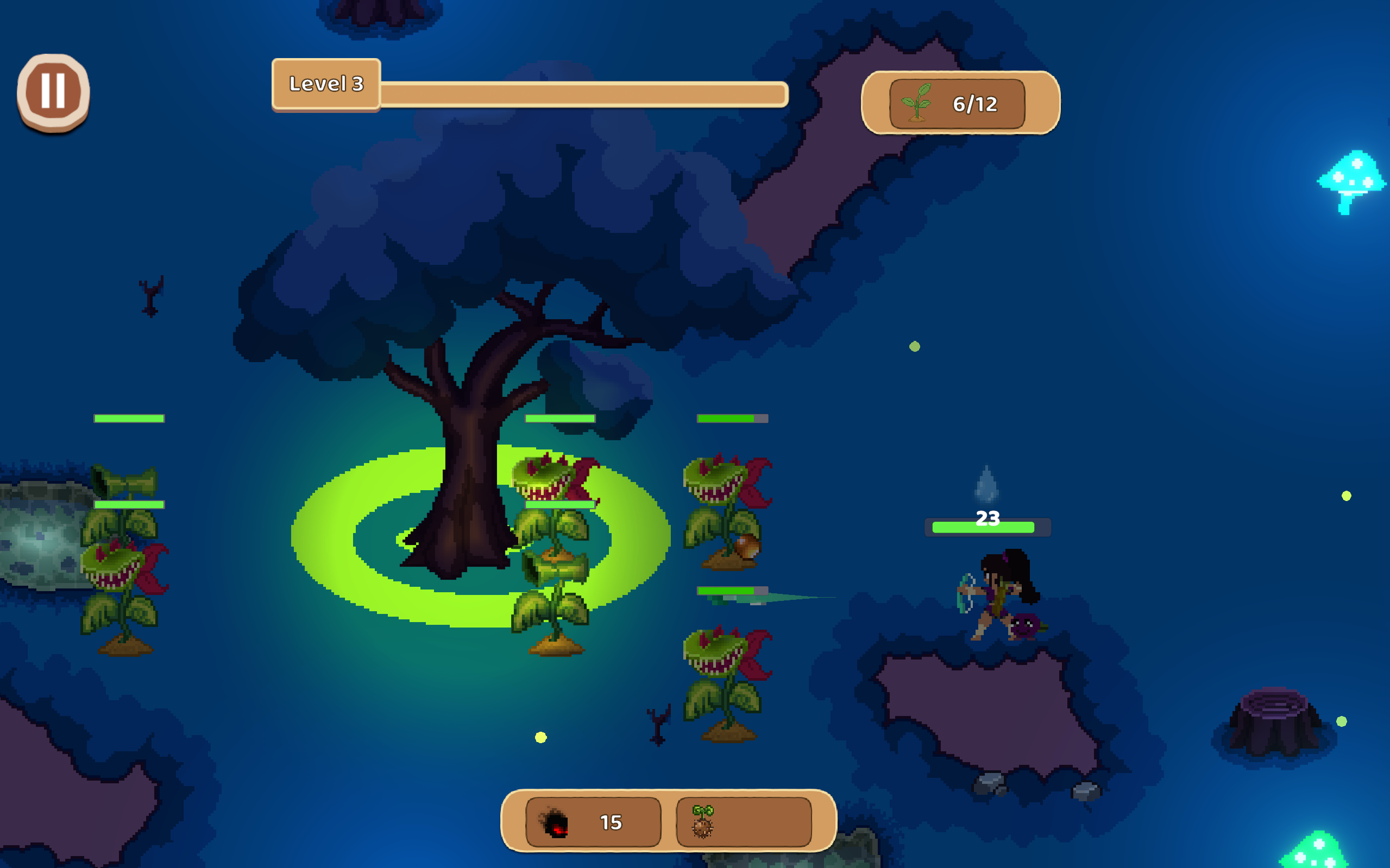 "Atacar" em inglês tem dois "t"s (Attack) | Talia é o modo easy, não precisa correr tanto por causa do arco e dá pra ficar spammando flechas sem se preocupar em receber dano | o urubuzão/morte de chefe final é bacana mas achei meio fácil. Quando ele fica se recuperando depois de atacar fica muito fácil de atacar | Gostei da diferença das plantas, faz você planejar onde vai colocar cada uma. A que dispara parece ser a melhor por causa do alcance e de como os upgrades deixam ela muito melhor | Floresta noturna é um mapa mais difícil, é mais difícil de enxergar em alguns momentos mas também é muito bonito. Bem interessante essa diferença de dificuldade com o mapa. A água em lugares diferentes e mais distantes ajuda a mudar e dificultar um pouco mais também | Fixar a progressão na quantidade de sementes plantadas e molhadas é bem bacana, faz você se movimentar pelo mapa pra pegar mais sementes e molhar em vez de só ficar em uma área | Soundtrack boa d+ e as diferenças no mapa e pro chefe foram bacanas tbm 🔊🎶🔥 | alguns inimigos não entendi direito (um que parece ser uma pilha de areia com ossos e outro que é tipo uma máquina pegando fogo). Meu favorito provavelmente é o tronco com um machado na cabeça com uma serra elétrica dentro dele e um que se move devagar até que tu dá dano suficiente aí sai um outro mais rápido de dentro dele | Muito legal os personagens fazendo uns combos com movementos diferentes quando tu continua atacando.